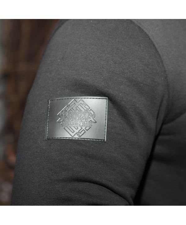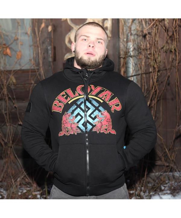 Мужская толстовка на молнии "Каменные псы" от Белояр с капюшоном на кулиске и карманами-кенгуру. На груди тематический, контрастного цвета, принт. На рукаве и капюшоне фирменный ярлык с биркой. Славянский стиль для славянского народа.