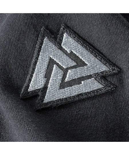 Изготовлена из высококачественного хлопка, имеет два передних кармана, отделанных лентами. На левом рукаве небольшая этикетка с логотипом бренда. Капюшон украшен толстым шнуром и фурнитурой с логотипом бренда. На передней части толстовки — небольшая вышитая нашивка с скандинавским символом. Спинка толстовки украшена крупным графическим изображением в скандинавском стиле, выполненным выпуклой печатью.
